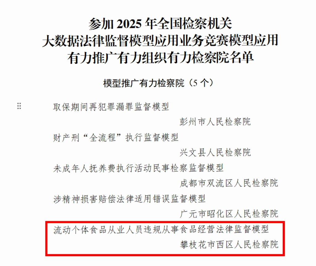 为进一步推进数字检察战略实施,2025年6月至12月,最高人民检察院组织开展了全国检察机关大数据法律监督模型应用业务竞赛。四川省检察机关根据各地推广和应用院次情况开展评选,发布了《关于表扬参加2025年全国检察机关大数据法律监督模型应用业务竞赛模型应用有力推广有力组织有力检察院的通报》。其中,西区检察院获评“模型推广有力检察院”,系全省获此殊荣的5个院之一,攀西地区唯一入选的基层检察院。